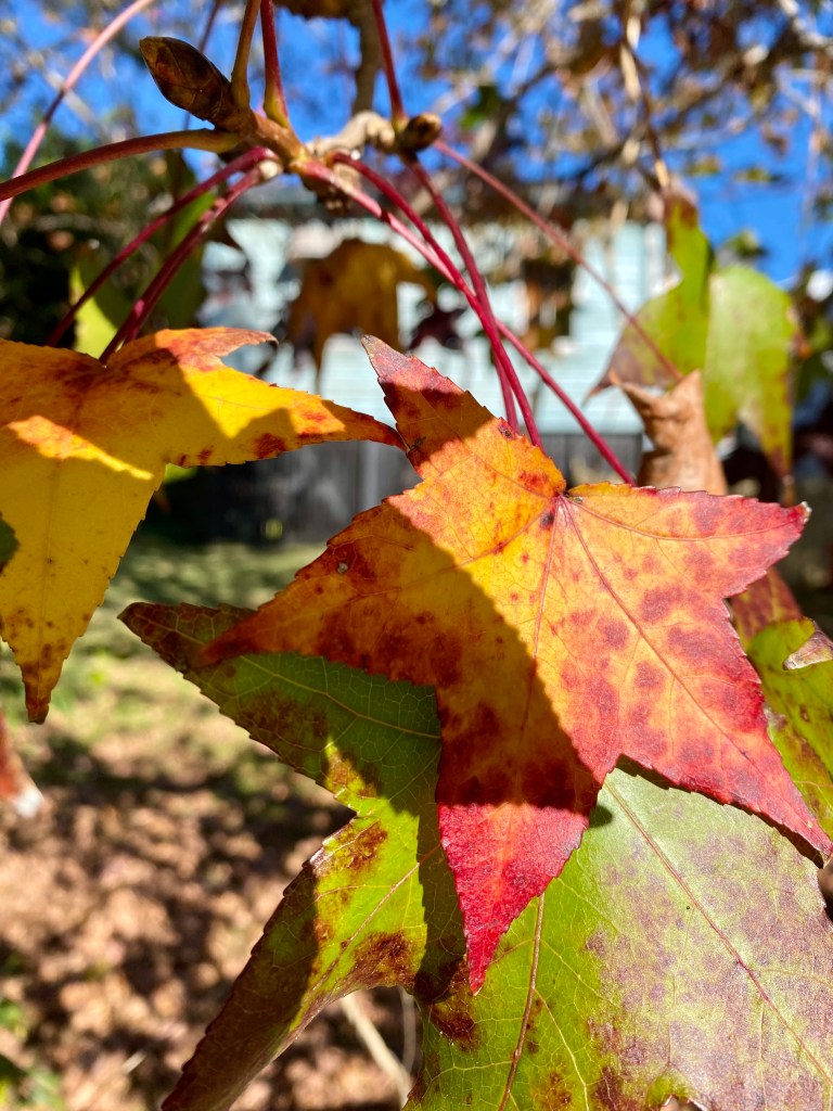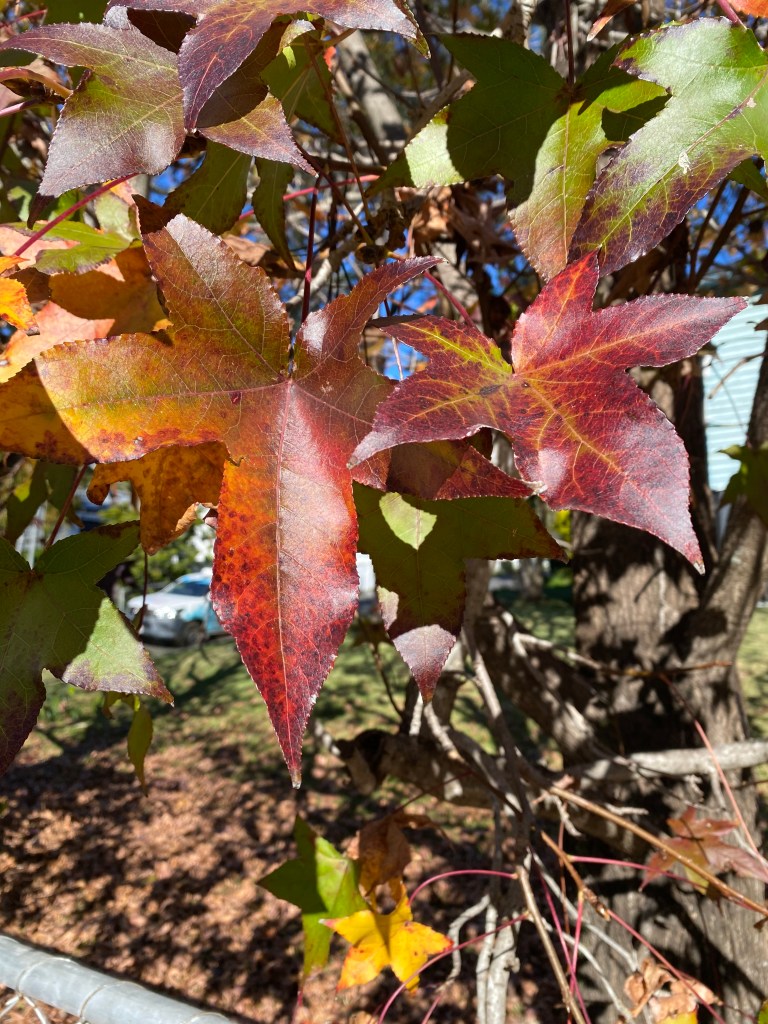 The ever changing colours of a sweetgum catches my eye as I head for a walk down the creek.