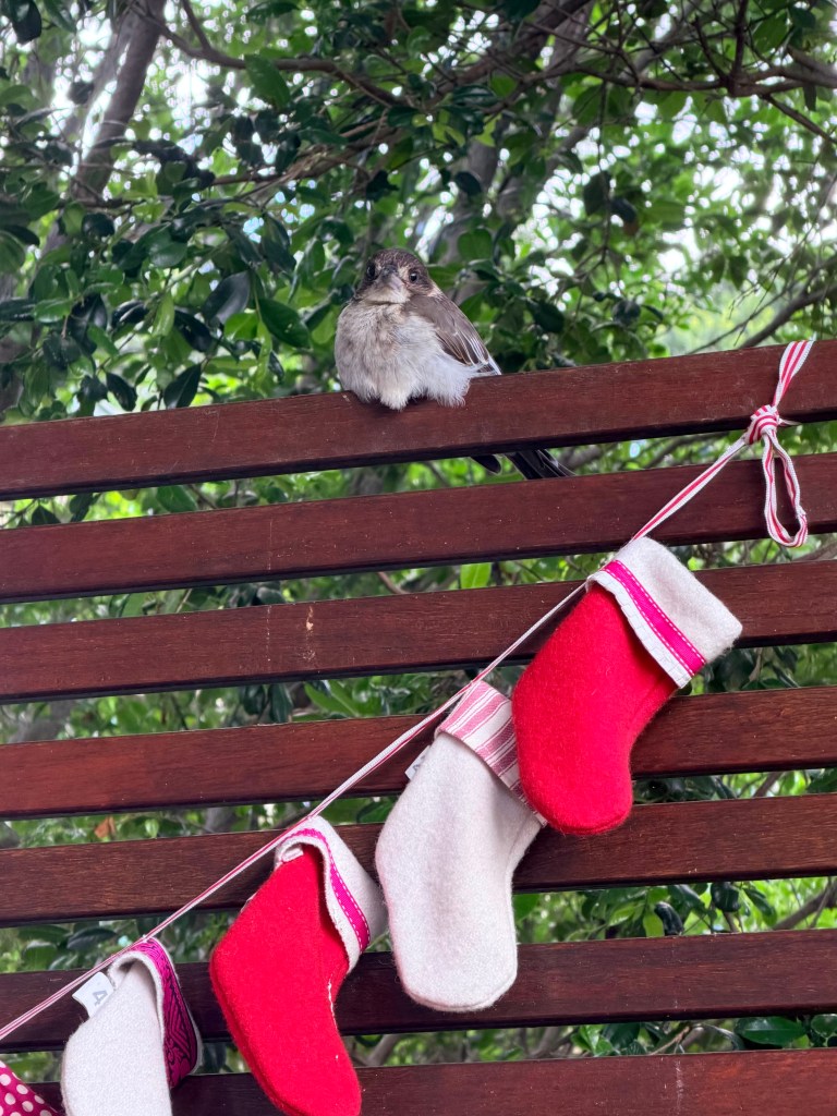 My baby butcher bird is taking a moment – to review and reflect. It’s the first time I have seen it sitting on the screen. It seems comfortable and happy.