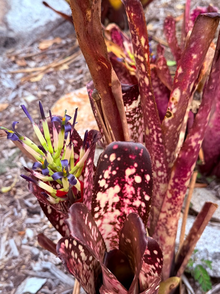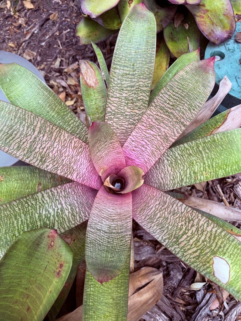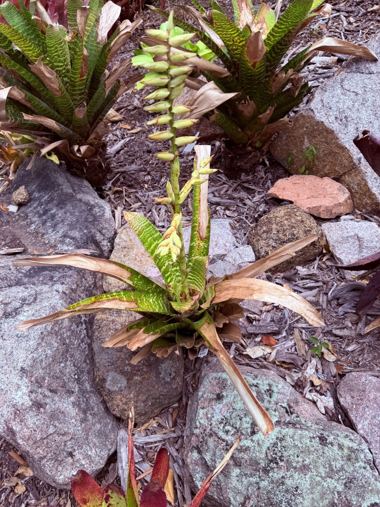 We ate our bromeliad just the other day – our very own pineapple, grown from a top. They take about 2 years to mature !