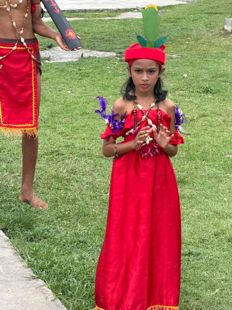The warriors dance talks of war and resistance though the two girls at the front wore nutmeg and clove representations in their headdresses and they swayed gently while the warriors battled it out in the background.