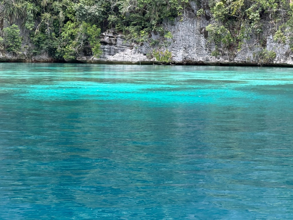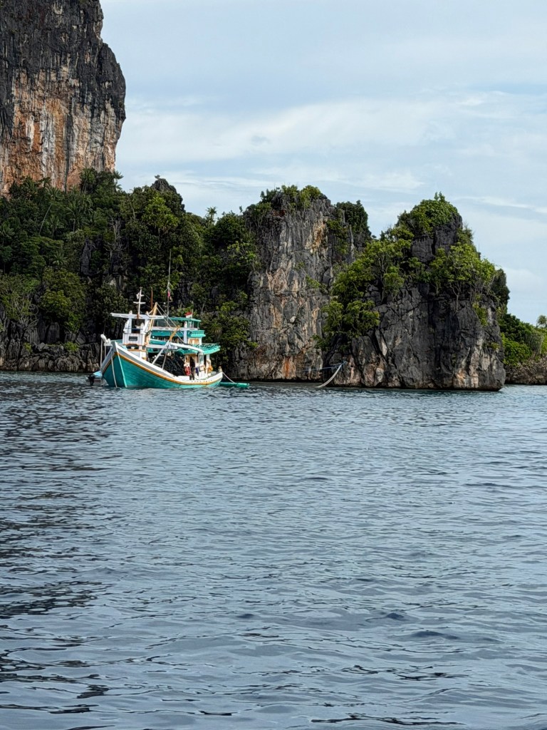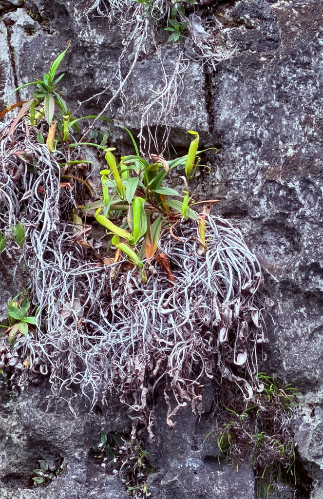 In all its glory. Towering rocks covered in ferns, betel nut palms, many pitcher plants and flowering orchids. Rocks like Xmas trees, sheer faces and azure waters. Pretty much uninhabitable. A National Park. The snorkelling was great along an extensive reef where a coral tablecloth caught my eye extending out in the deep underneath as if waiting for guests. A clam of velvety green and pink. And many sea squirts. Purple penis like funnels, some orange with extensive veining and some yellow. We swam through many shoals of darting fish.