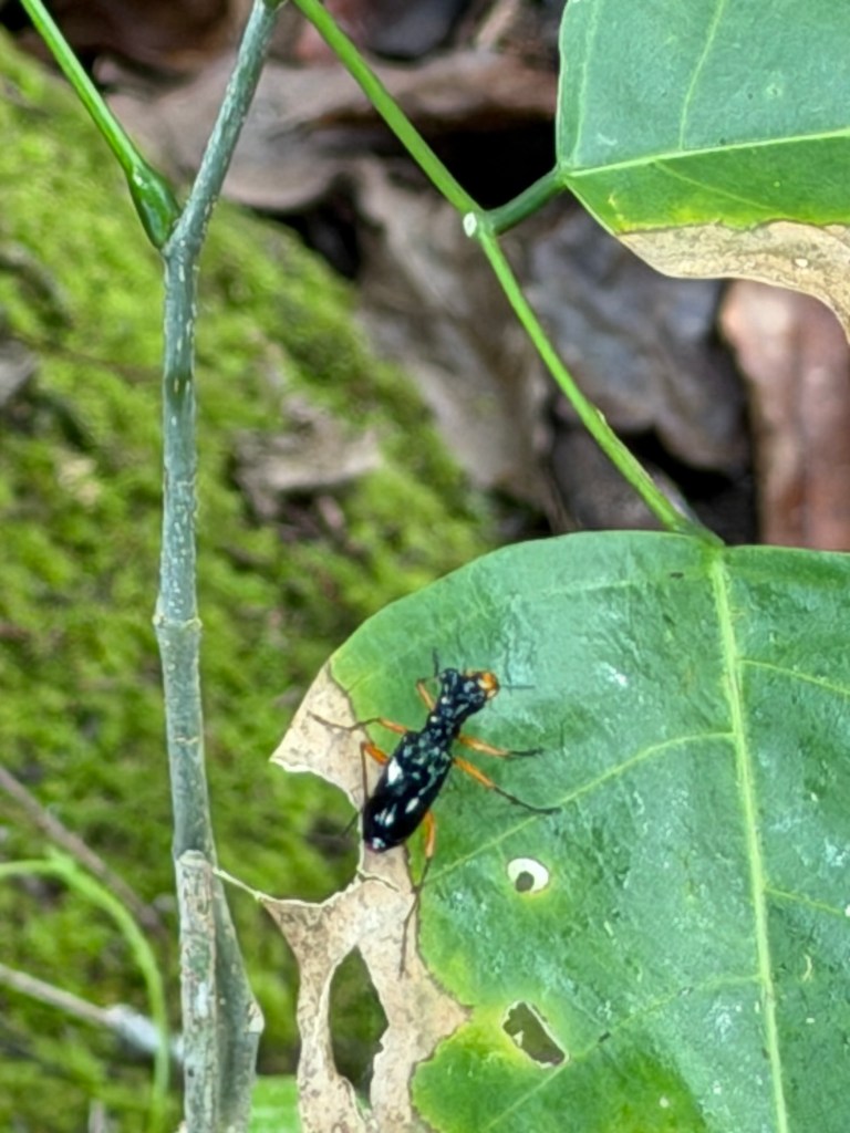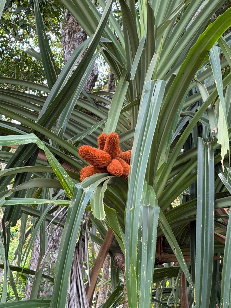 Crossing directly across we stopped at the medical centre and made our way into the bush to look for birds. Found a lovely butterfly and the very colourful fruit of a pandanus tree.