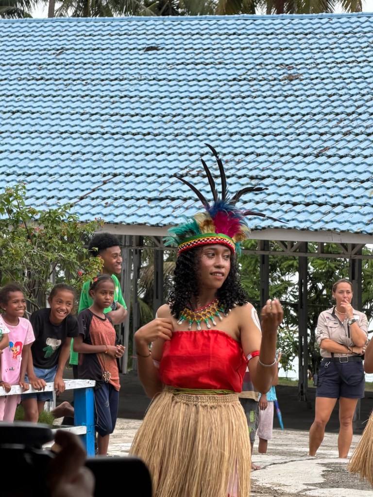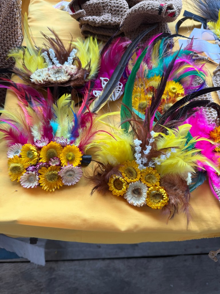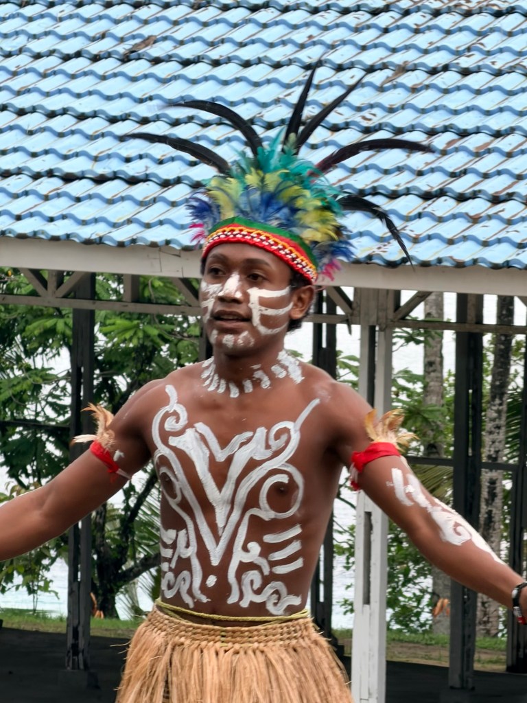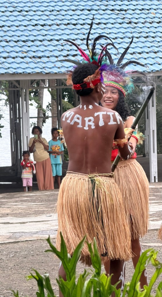 The locals had a small handicraft market with some headdresses which are so colourful but would never pass Aussie customs. Some batiks and carvings too.