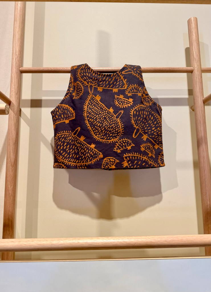 They are conversation starters, a retelling of stories and an education of what First Nations have to offer. This is Graham Badari’s Rock Wallaby and Echidna top, inspired by the high country of the Arnhem Plateau.