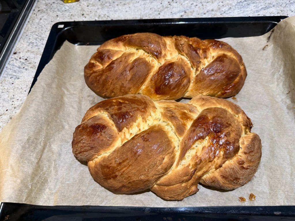 We will compete at breaking each other’s red-dyed eggs. We’ll drink wine, eat halva (the tahini sweet across the Middle East), koulouria (traditional Greek Easter shortbread), and tsoureki – a sweet bread with mahlab, like the Jewish challah.